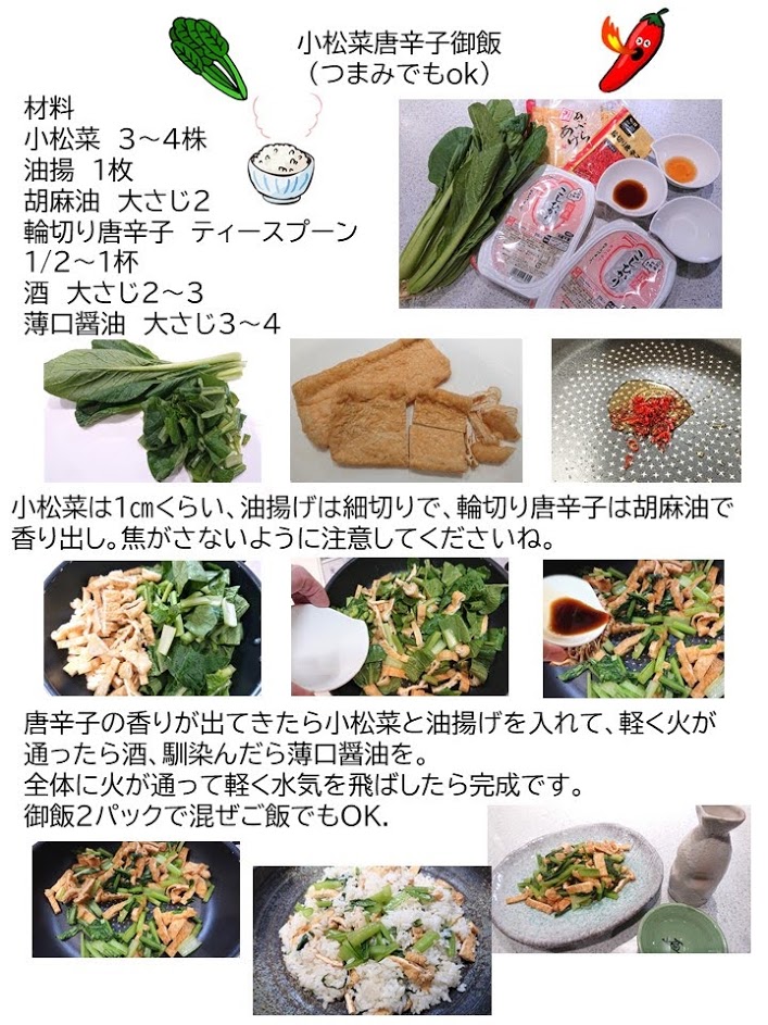 小松菜は1㎝くらい、油揚げは細切りで、輪切り唐辛子は胡麻油で香り出し。焦がさないように注意してくださいね。