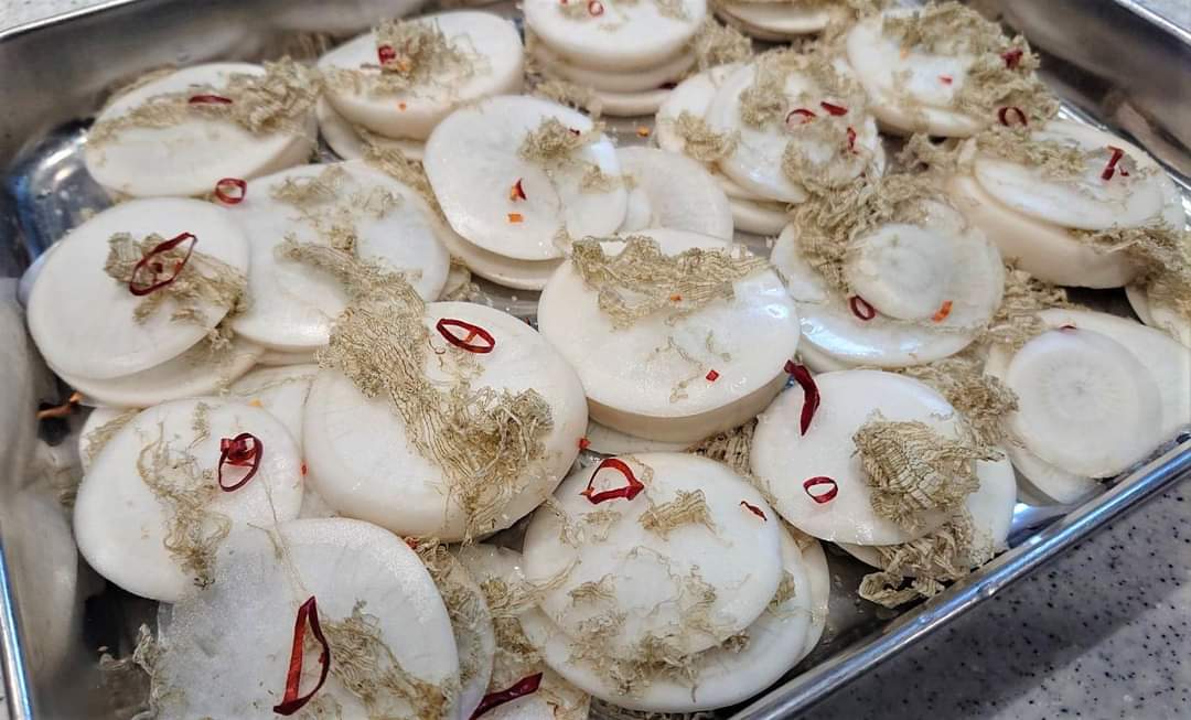 千枚漬けは甘みを入れることが多いのですが、この時期の蕪の甘みととろろ昆布の味わいで十分美味しく仕上がります。
