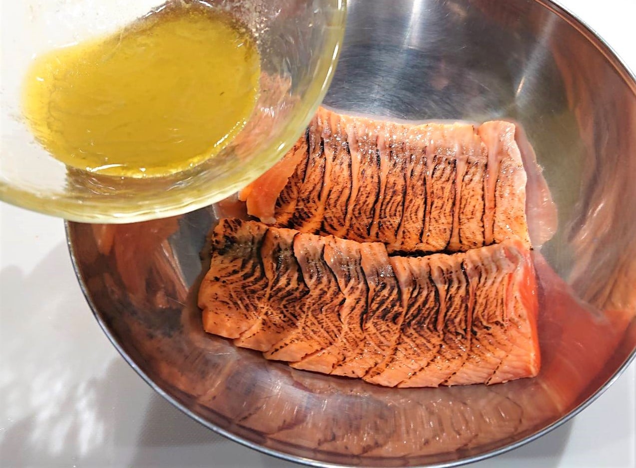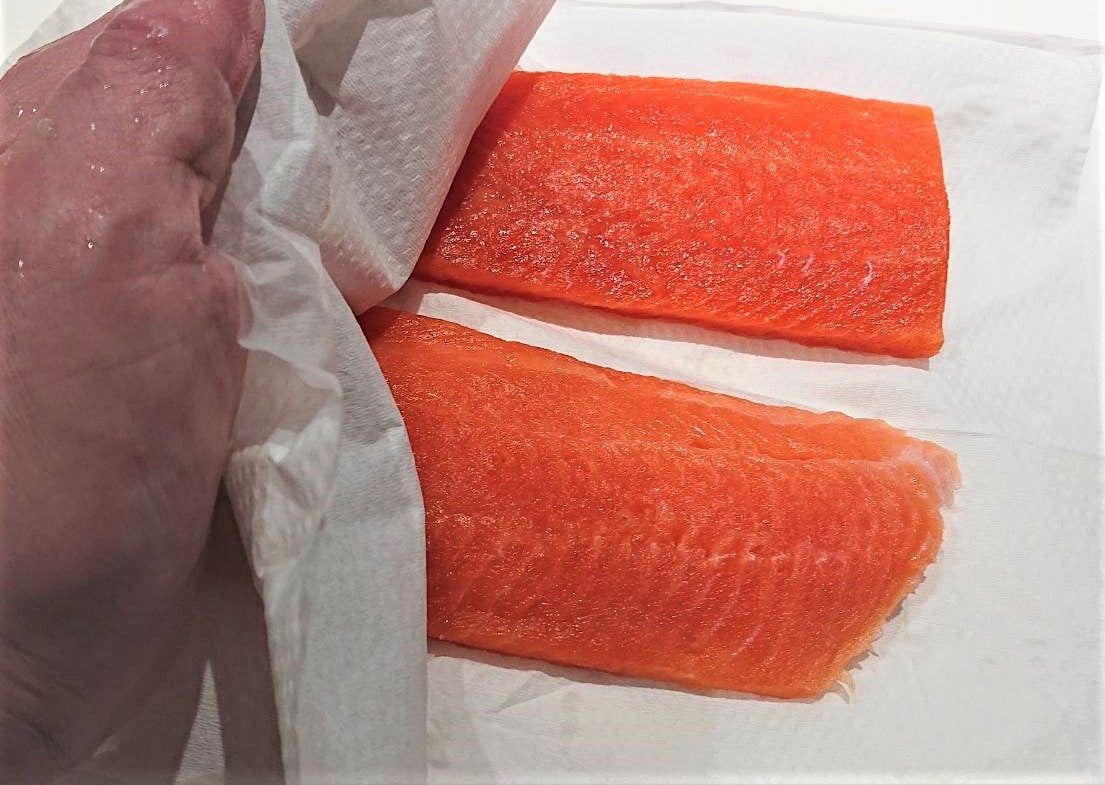 1∼2時間冷蔵庫で寝かせたサーモンは表面に水気が浮いてきています。