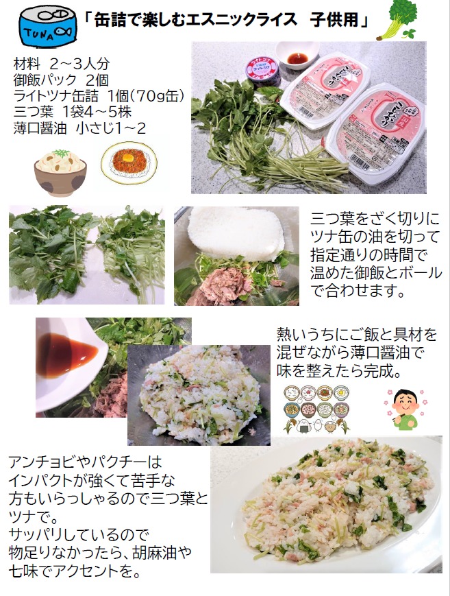 三つ葉をざく切りにツナ缶の油を切って指定通りの時間で温めた御飯とボールで合わせます。