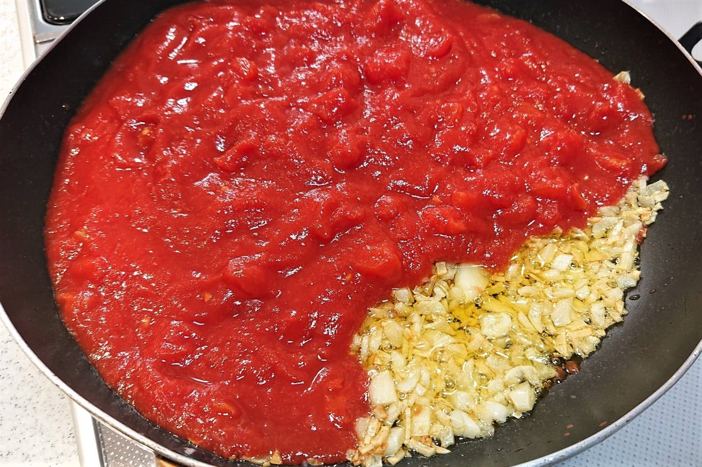 今回は1/4~1/3のニンニクが色付いたところでトマトの水煮投入。