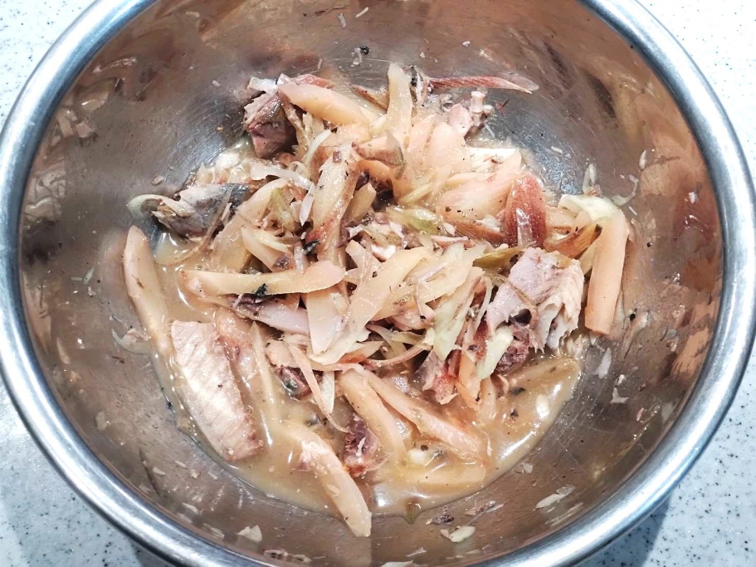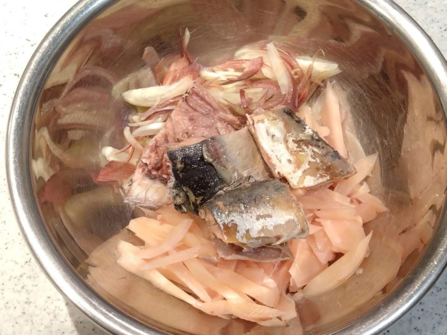 新生姜と食べやすい大きさにちぎったサバの水煮を合わせて、素材が浸る程度に缶の煮汁を加えます