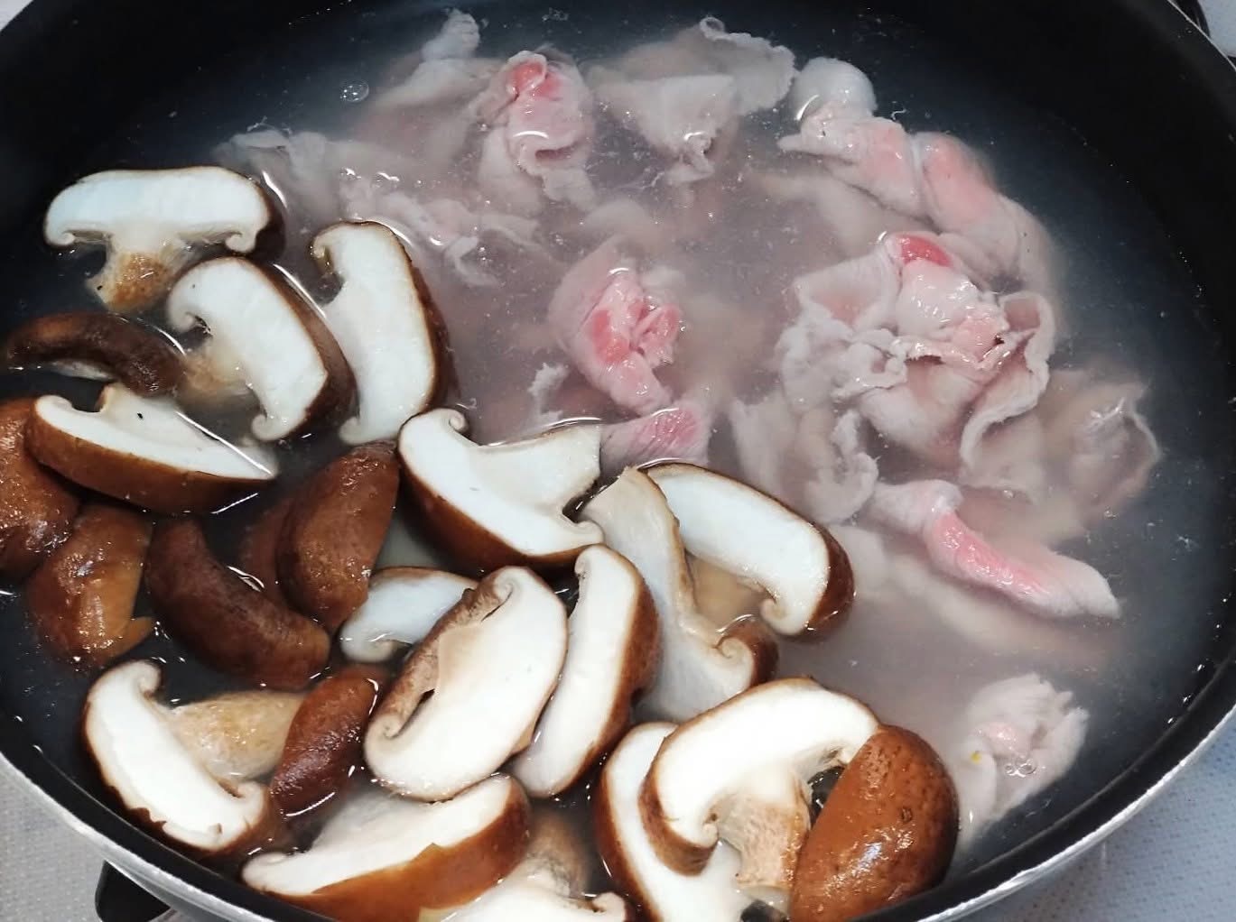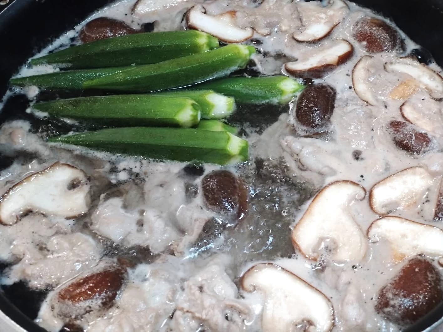沸かしたお湯に豚肉と椎茸を入れて再沸騰したらオクラ、再び沸いたところでお湯をシッカリと切って、ココネクタスとペプチド出汁を馴染ませて味見をしながら薄口醤油。