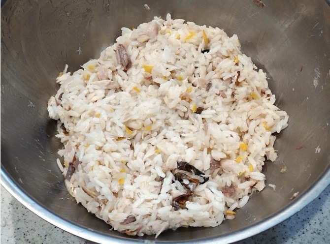 熱いうちに果汁と馴染ませた柚子皮、ほぐしたサバと合わせて軽く混ぜて味見。