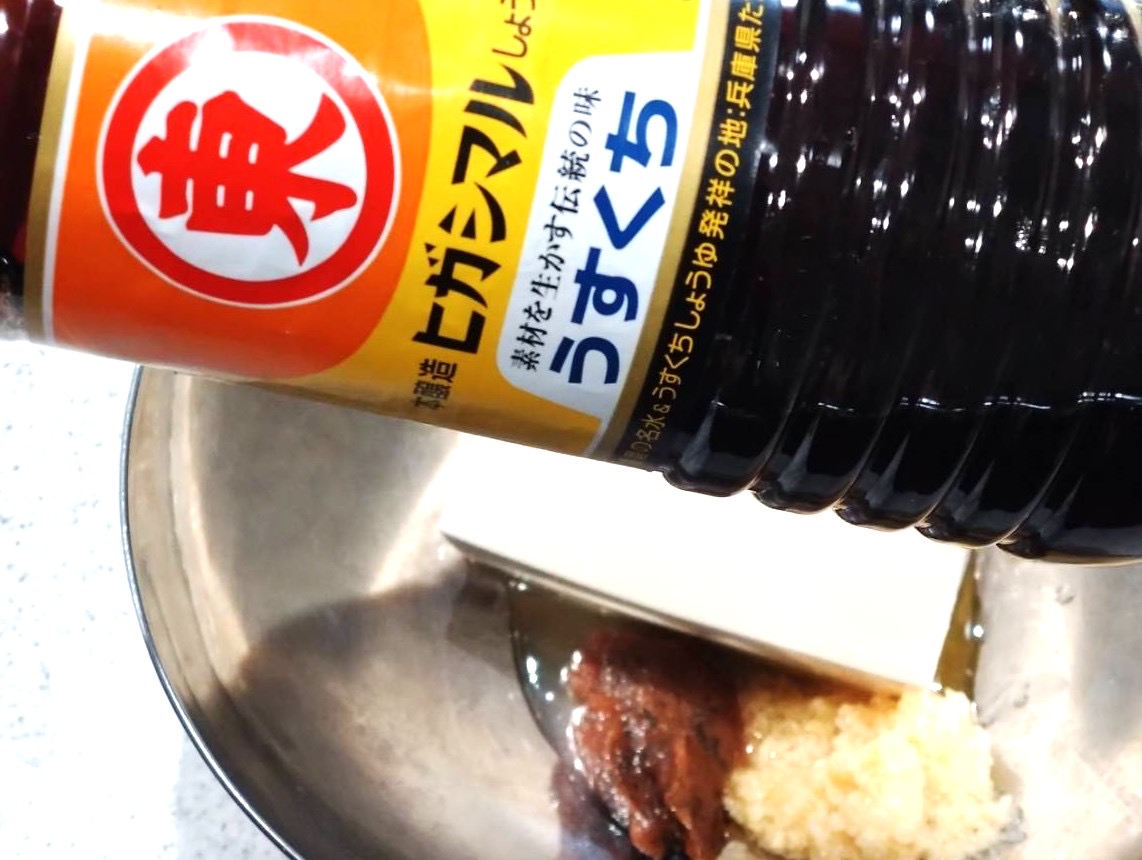 薄口醤油、酢、カプレオ、ココネクタスを味見をしながら合わせていくと、豆腐の粒が残るこんな感じで仕上がります。