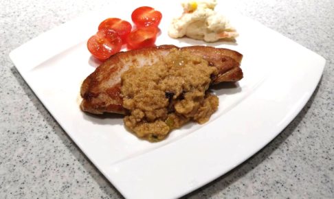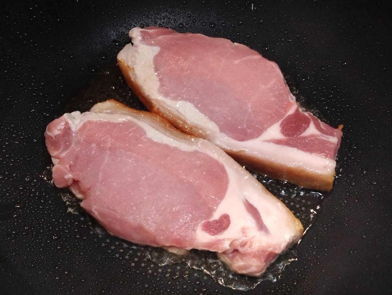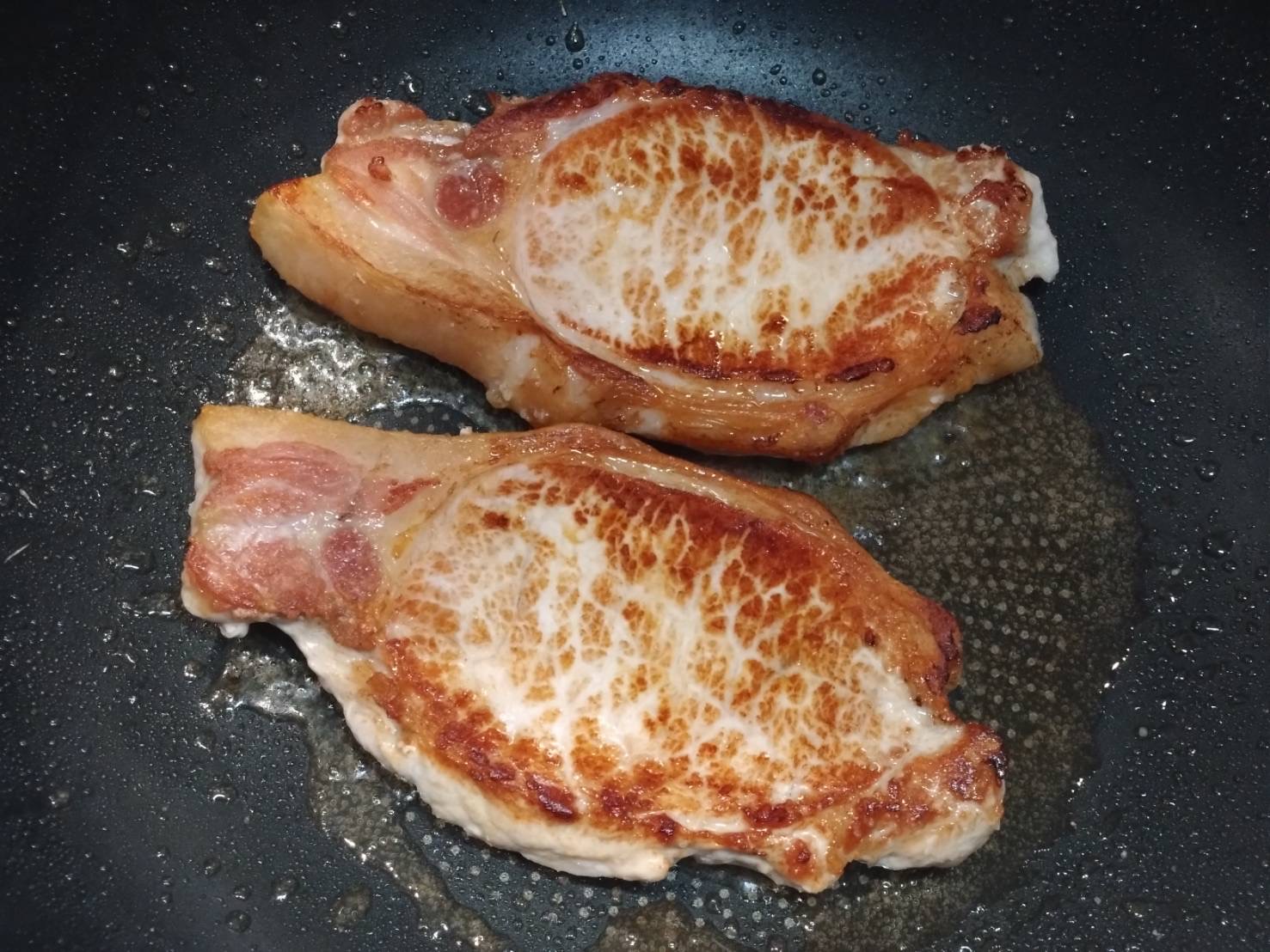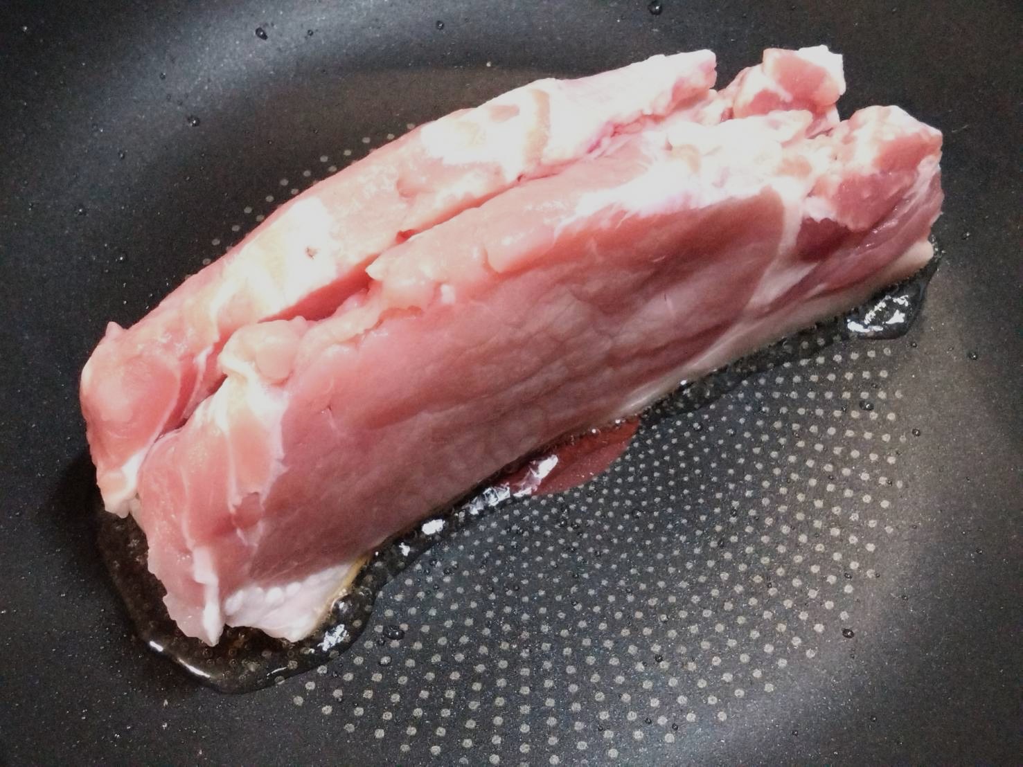 豚肉は、立てて火の通りにくい脂身から焼いて、出てきた油をかけながら火を通すとシットリ仕上がります。