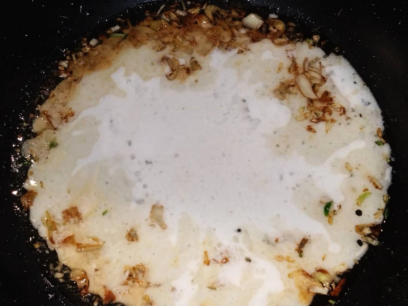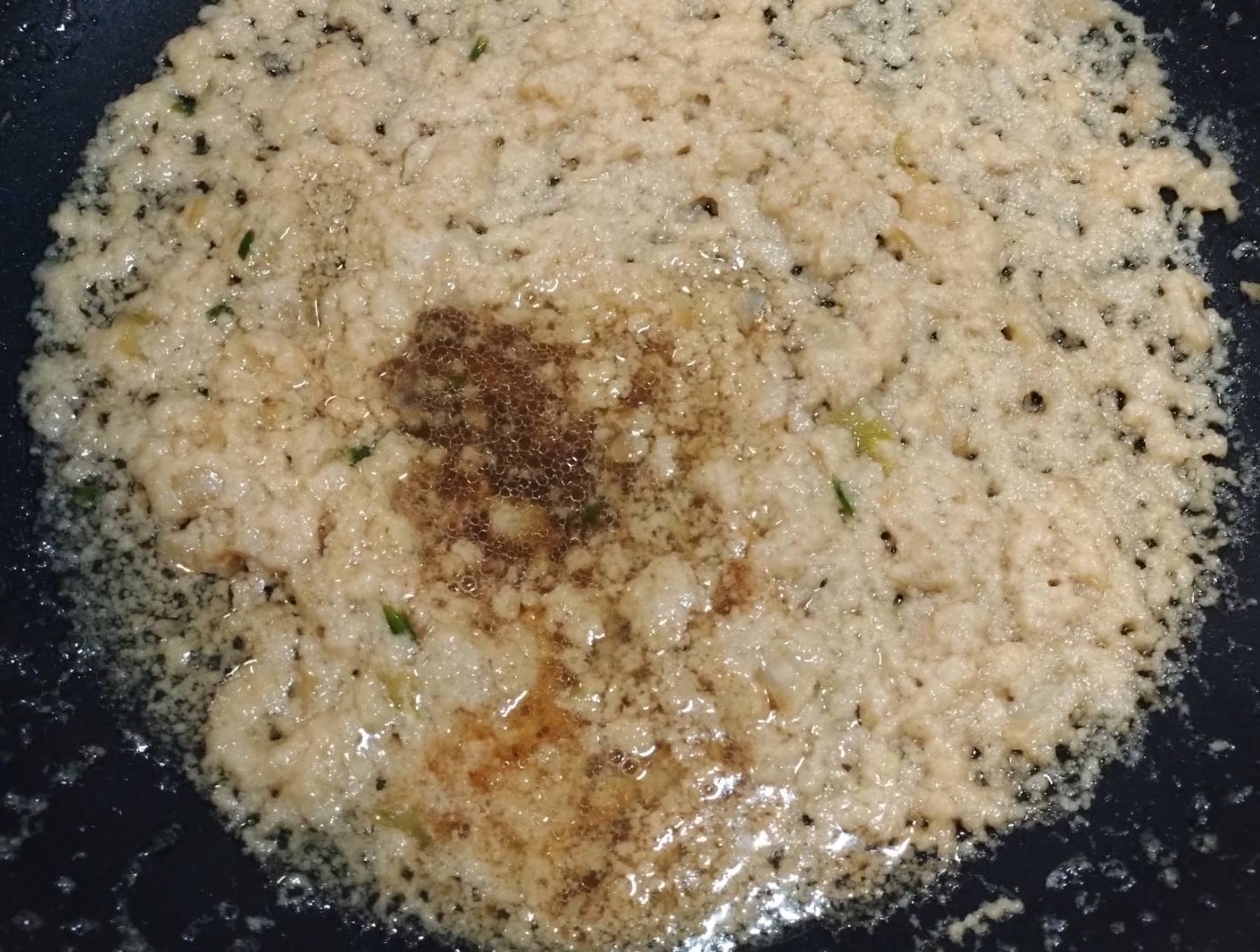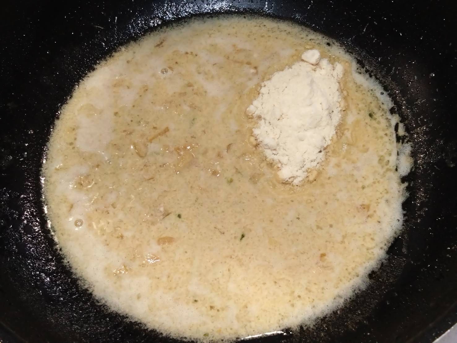 フラワーシッカリが馴染んでソース状になったら、肉汁を注ぎ入れてコクをup。