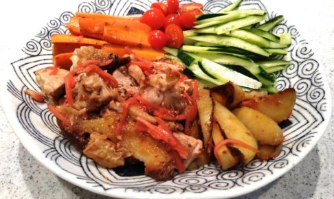 付け合わせは、手間をかけずにミニトマトと市販のポテトサラダ。