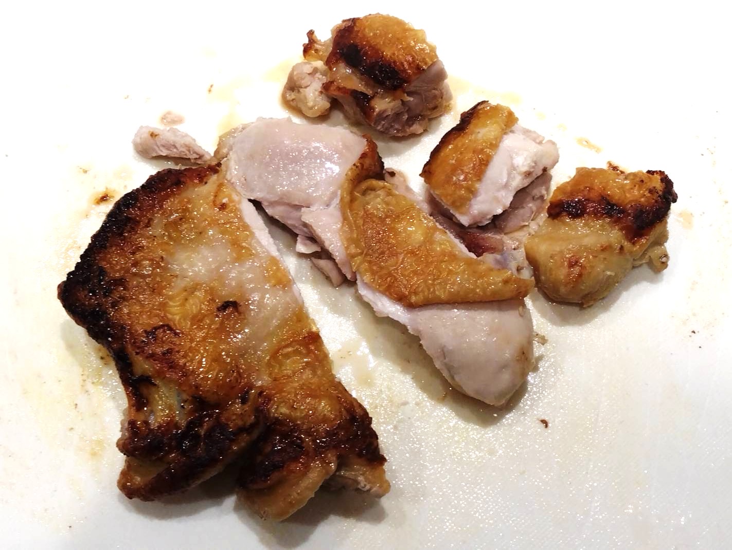 5~10分放置して鶏肉が落ち着いたら、フライパンから取り出して一口大にカット。