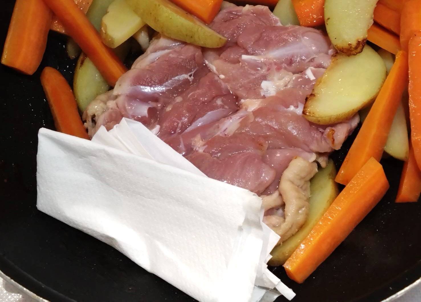 鶏肉に重しを乗せると、皮目がきれいに焼けます。