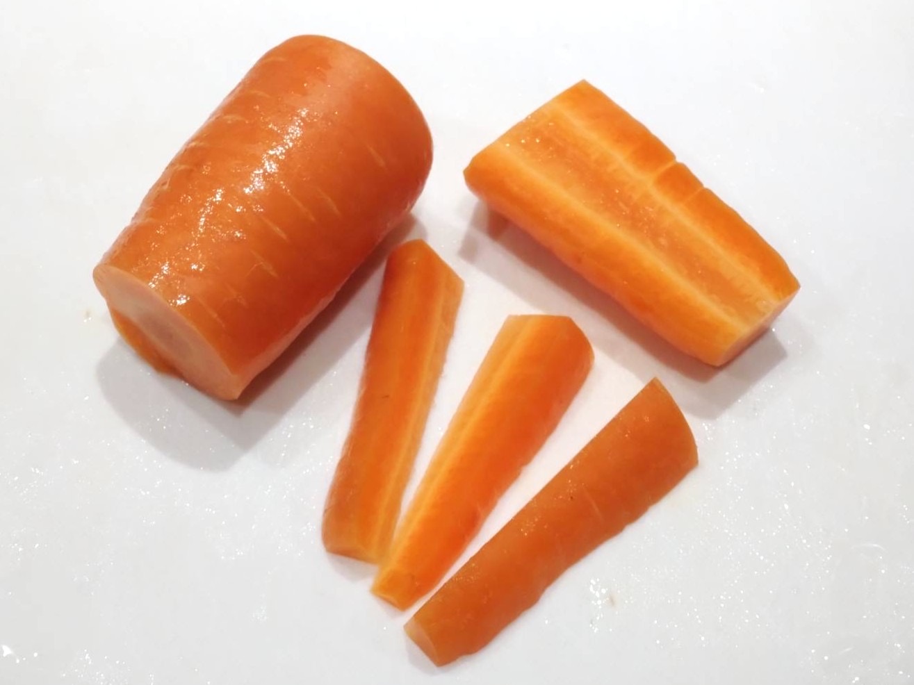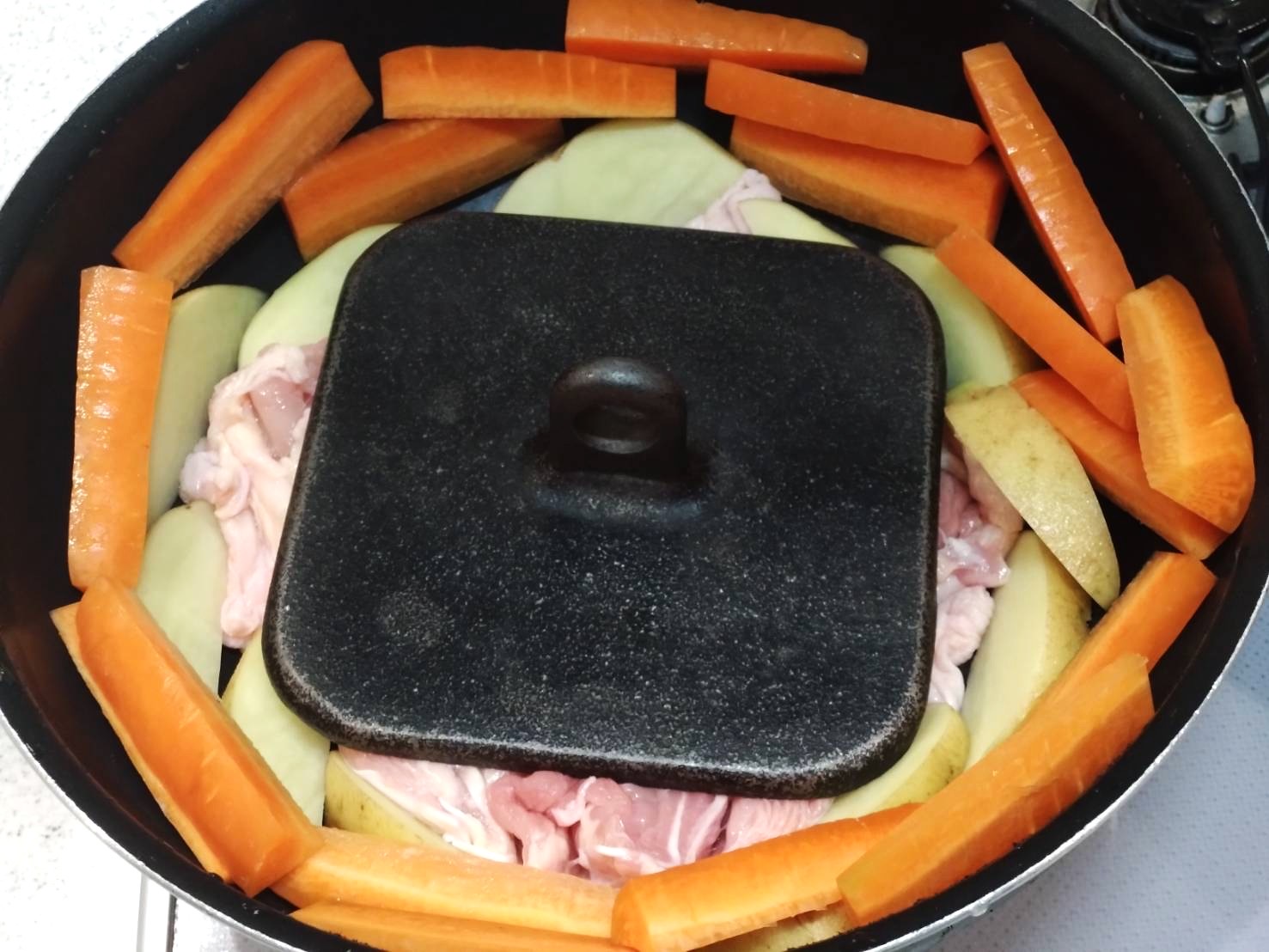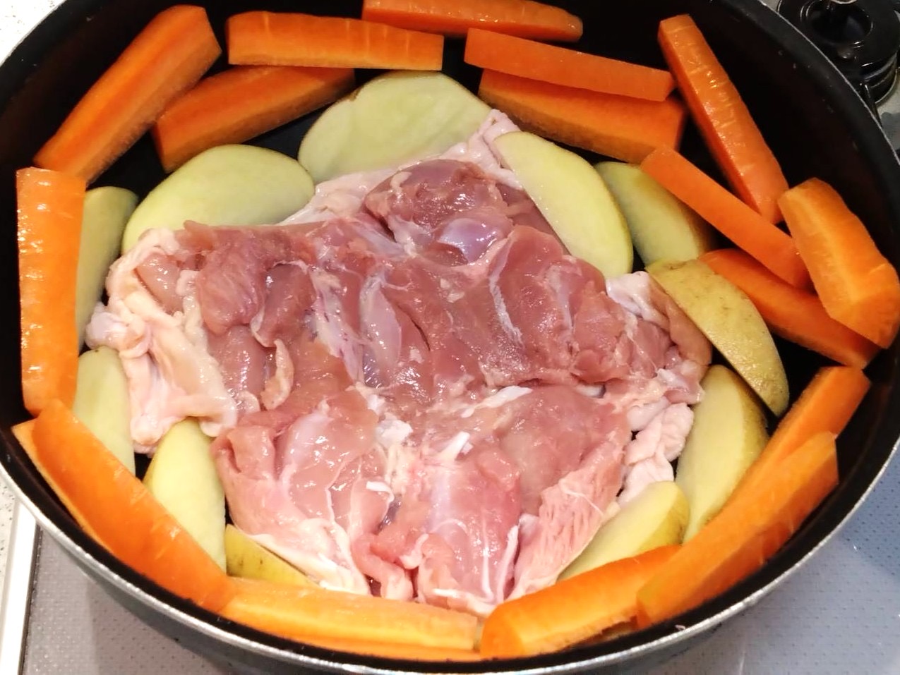 ニンジンは、多少生でも美味しいですが、ジャガイモには火を通したいので、内側ジャガイモ、外側ニンジンの同心円に。
